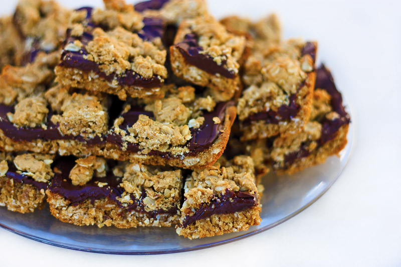 In a large mixing bowl, cream butter with peanut butter. Beat in sugar, egg, and vanilla. Add flour, soda, and salt. Add oats. Press about 3/4 of the mixture into the bottom of a greased 9x13 pan. Spread melted chocolate chips over the top. Crumble remaining peanut butter mixture over the chocolate. Bake in a preheated 350 degree oven for about 20 mins.
